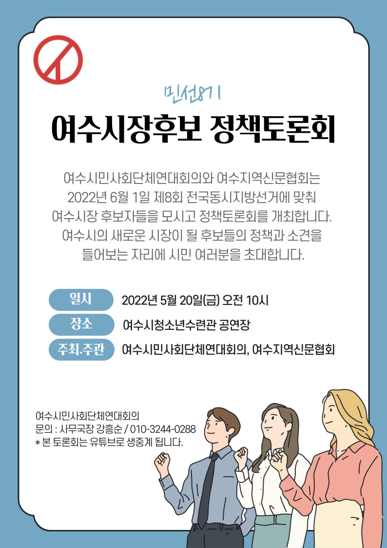 여수연대회의는 제 8회 전국동시지방선거를 맞아 향후 4년 간 여수시를 이끌어갈 후보를 선택하는 데 도움을 주고자 여수시장 후보 정책토론회를 다음과 같이 개최합니다.